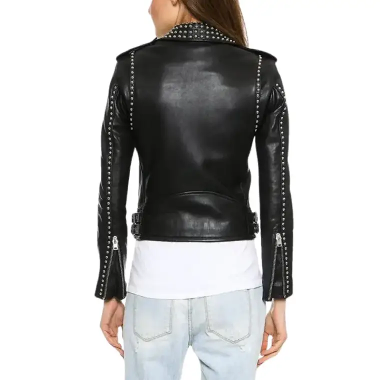 Designed for confident everyday styling, this jacket brings a polished edge to the classic women’s black leather biker jacket silhouette. The lapel collar and extensive stud detailing on the collar, sleeves, and back seams add character without overwhelming the clean, wearable shape.