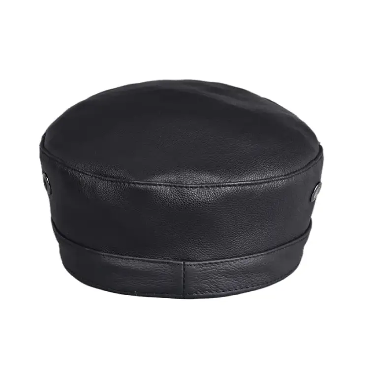 To keep you cool, this genuine leather military cap features breathable metal eyelets built into the sides to let air flow freely. With reinforced stitching for extra strength, this durable plain leather cadet hat stays in great shape. It is a solid, simple choice for men who are looking for a high-quality, flat top leather cap.