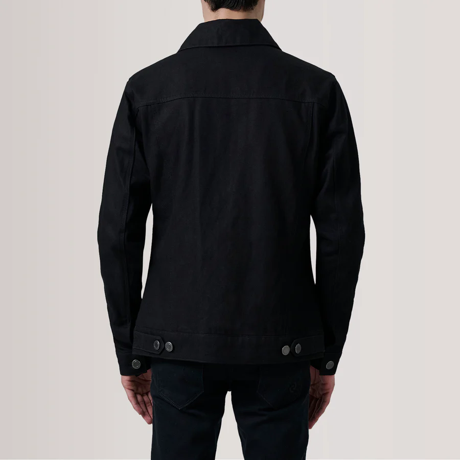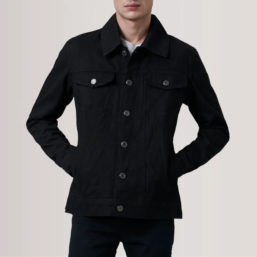 This black trucker jacket offers a sharper, more modern look while maintaining the authentic structure and durability expected from a classic trucker design.