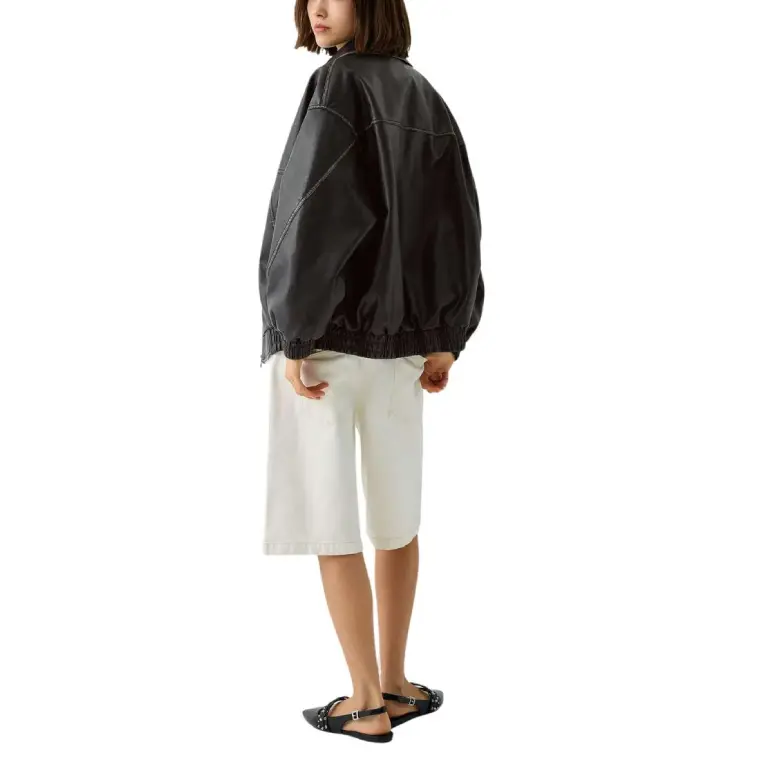 This dark brown leather bomber jacket features a shirt-style collar that adds polish without feeling formal. Balanced and versatile, it transitions easily from daytime errands to evening outings while keeping comfort and wearability front and center.