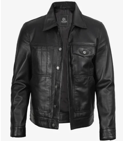 Black Washed Leather Trucker Style Jacket for Men