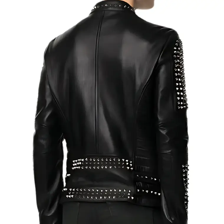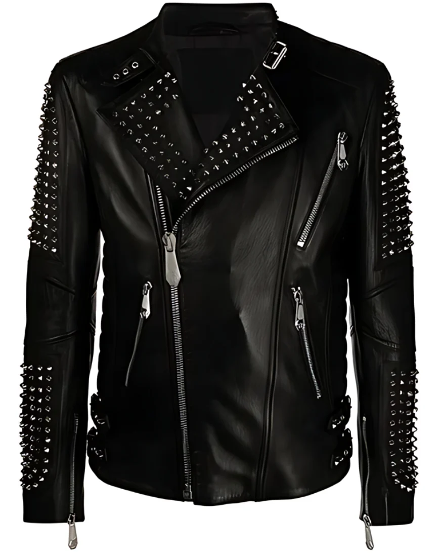 This Leone black studded leather jacket is built for men who prefer a sharp, performance-inspired silhouette with bold detailing. Crafted from real lambskin leather, it features convertible studded lapels with a buckled throat, allowing you to adjust the look based on your riding or styling needs. Subtle stud placement keeps the design aggressive without overpowering the jacket’s clean racer profile.