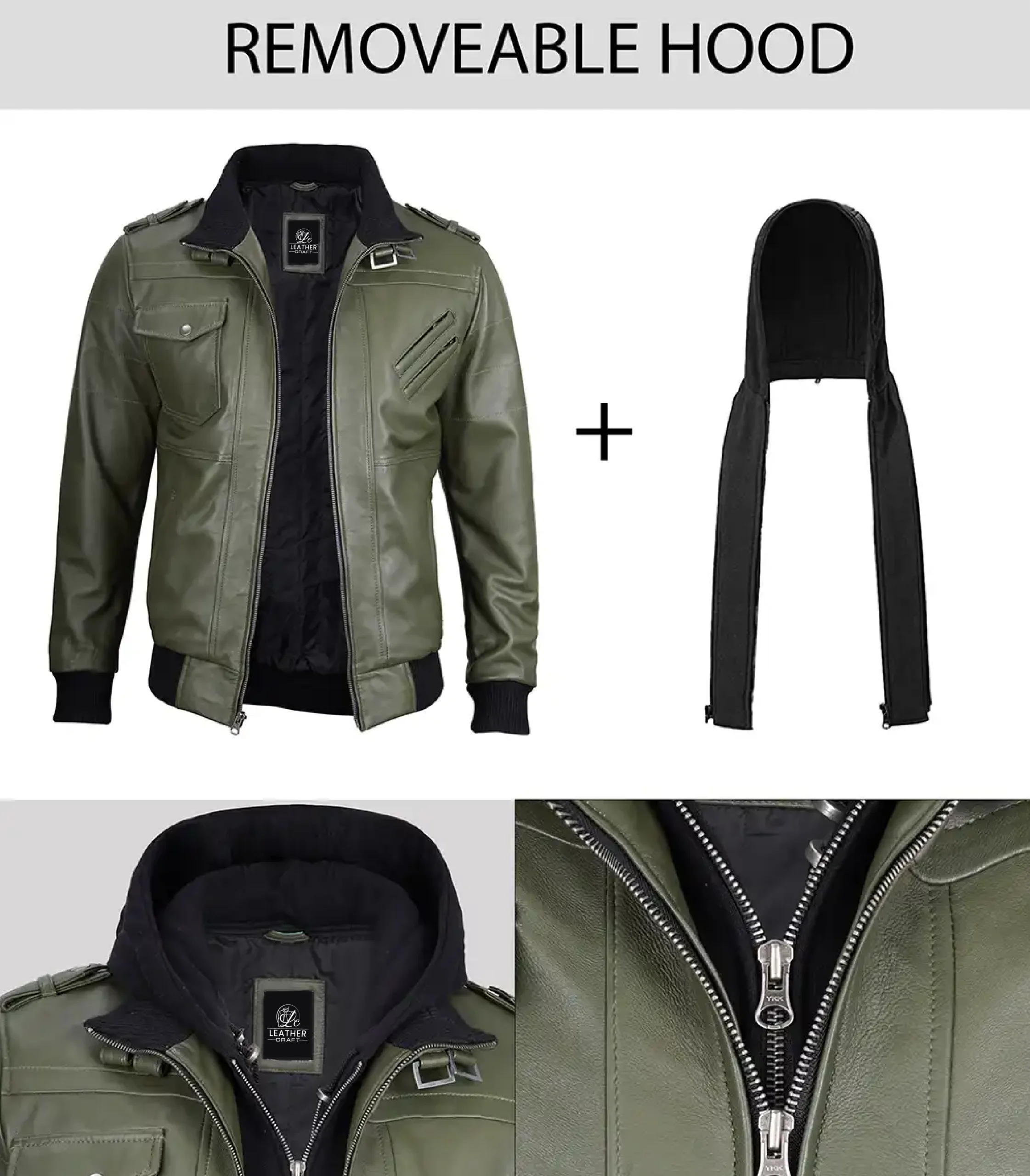 Men’s Olive Green Bomber Jacket with Removable Hood