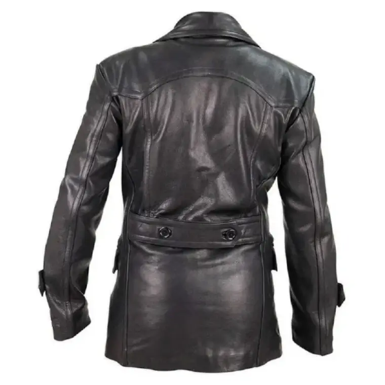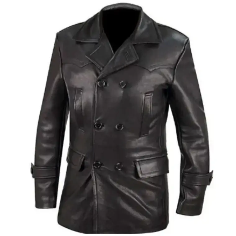 This coat delivers a bold presence rooted in classic tailoring. With its double-breasted front and aged finish, it reflects the character of a vintage black leather overcoat designed for men who prefer statement outerwear with depth.