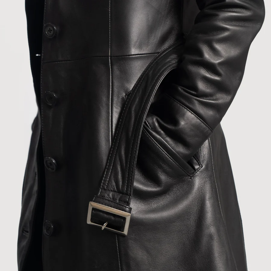 The moonlight black leather trench coat is a graceful and sleek piece that showcases a classic style for all the individuals who love to style comfort with grace.