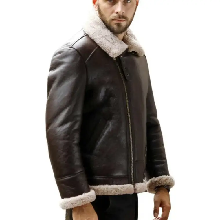 Designed as a brown aviator bomber jacket, it includes a shearling notch collar and roll-up cuffs and hem for added insulation. The earthy brown tone and classic detailing make it a dependable cold-weather statement piece.