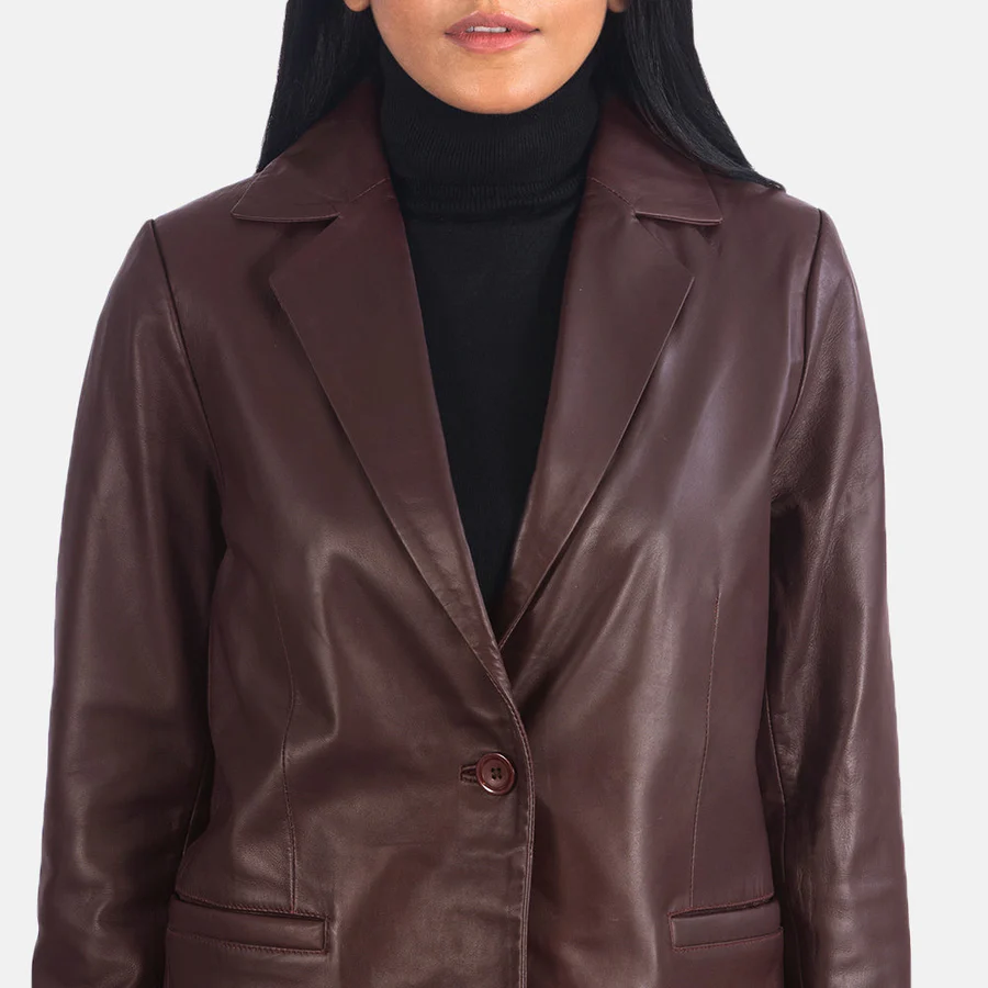 This Norma Maroon Leather Blazer contains a very silky hand feel and lifelong endurance because it is made of genuine, soft leather in an intense maroon hue.