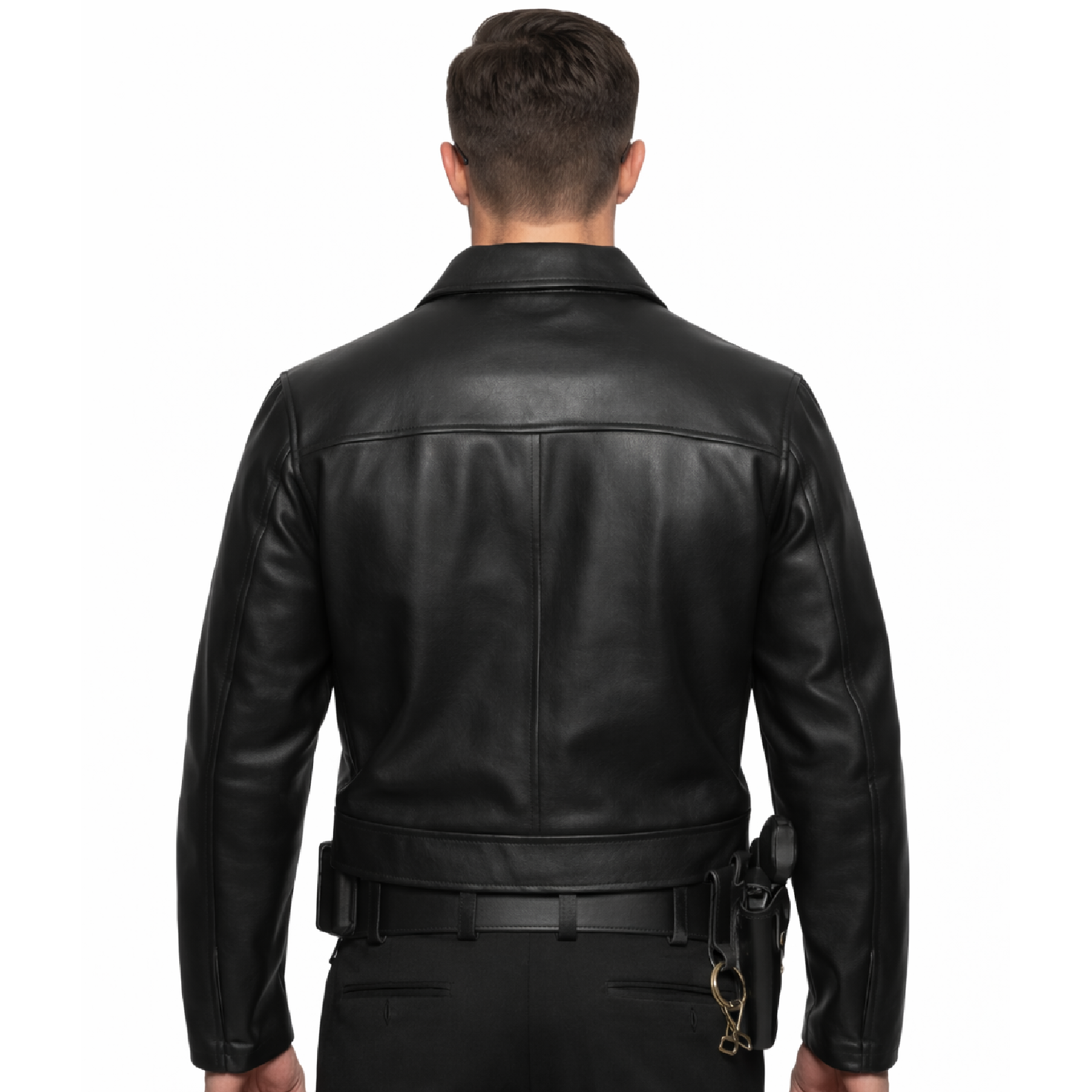 A police leather motorcycle jacket (B AGB) is a specialized law-enforcement jacket designed to sit above the duty belt, allowing officers to comfortably wear equipment such as firearms, radios, and handcuffs. The above the gun belt leather motorcycle jacket provides durability, mobility, and protection while maintaining the classic biker style used by motorcycle patrol units.