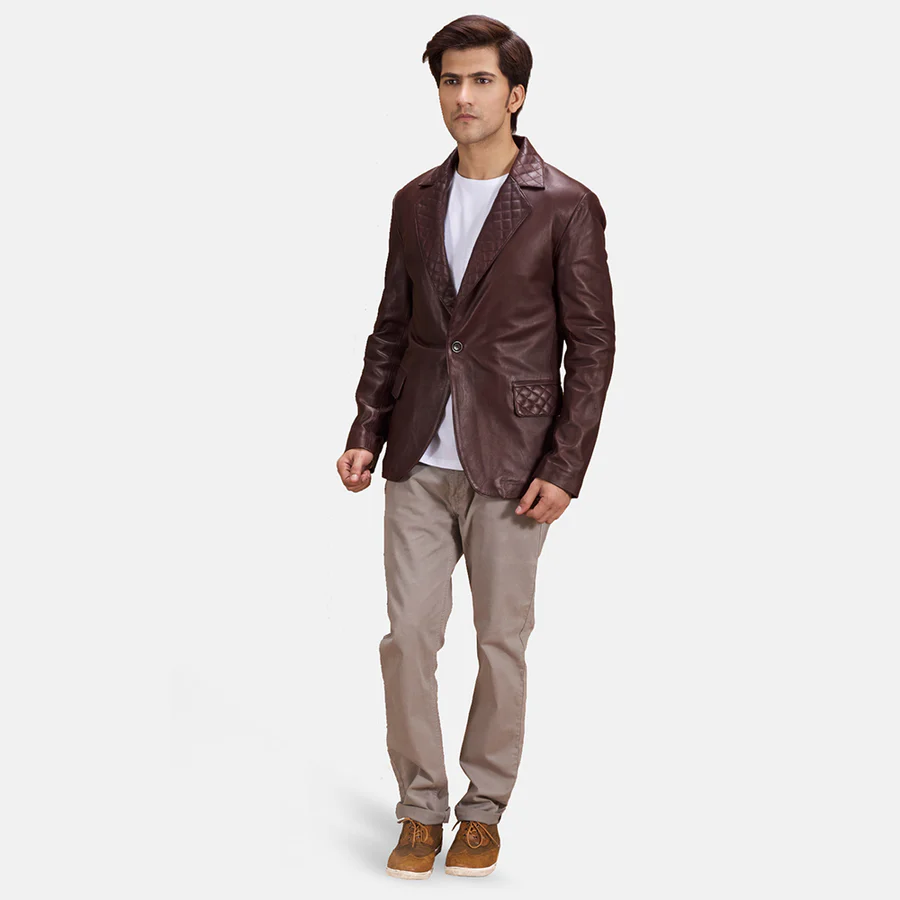 - A bold maroon leather blazer delivers a crisp vibe its rich tone stands out with edge, while the fit sharpens the overall feel.