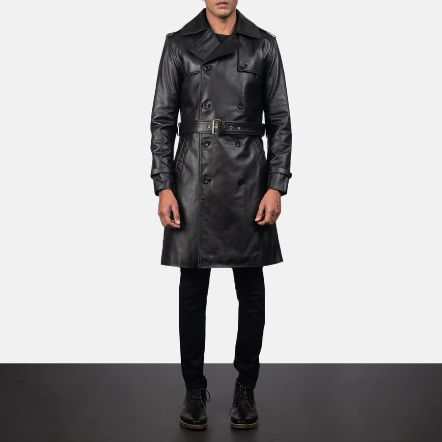 - Dramatic black leather duster coat made for men after a powerful, movie-like look on the streets crafted to stand out without saying a word.