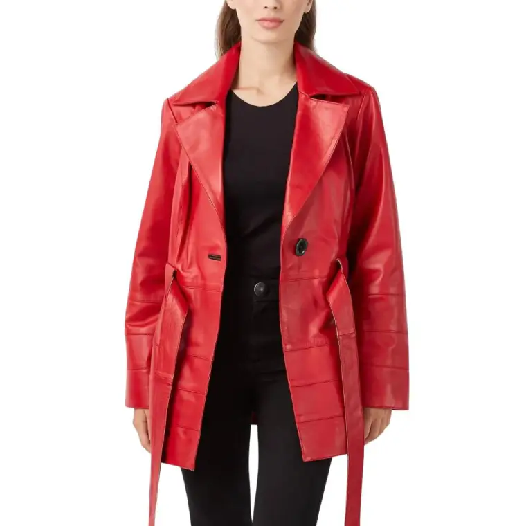 Styled as a women’s red leather coat, it features a button-front closure with a waist strap that allows a customized fit. The smooth inner lining keeps it comfortable for extended wear, while thoughtfully placed pockets ensure everyday practicality without compromising its sleek design.