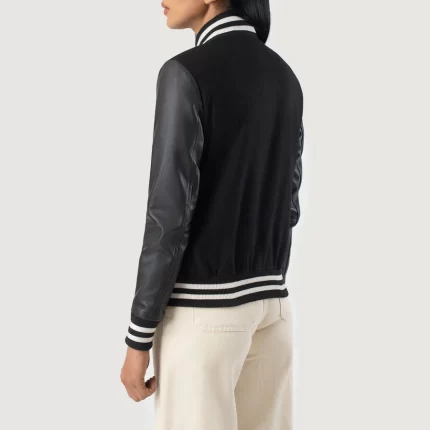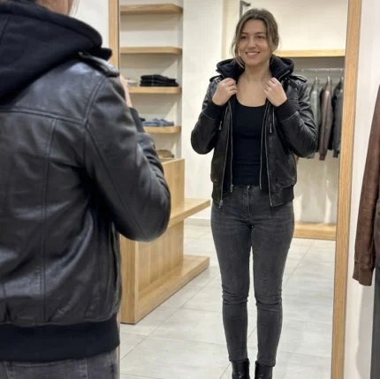 Roslyn Women’s Black Hooded Leather Bomber Jacket