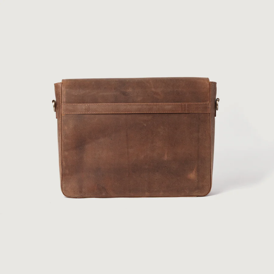 The mens brown leather messenger bag features rich pull-up cowhide tan brown leather, offering secure storage and durable construction.