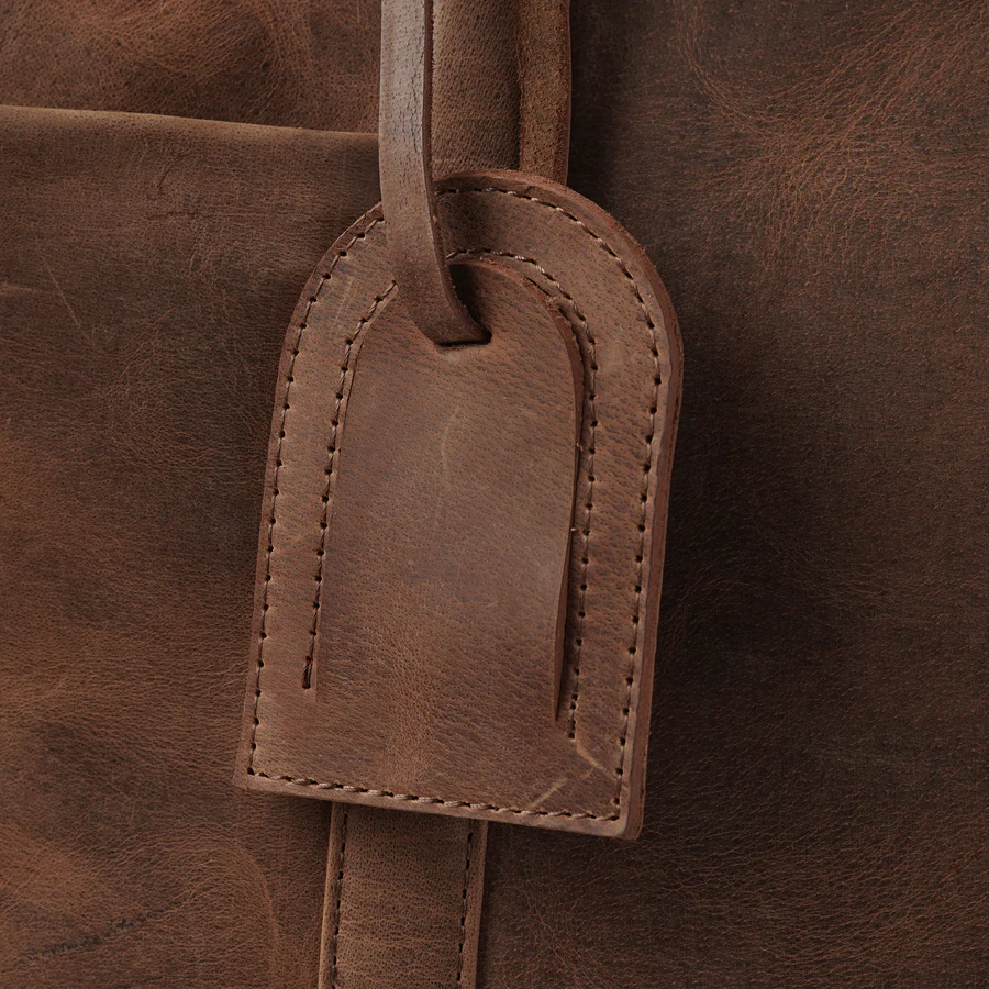 This tan leather duffle bag features rust-proof antique brass hardware, designed for long-term use and reliable performance.