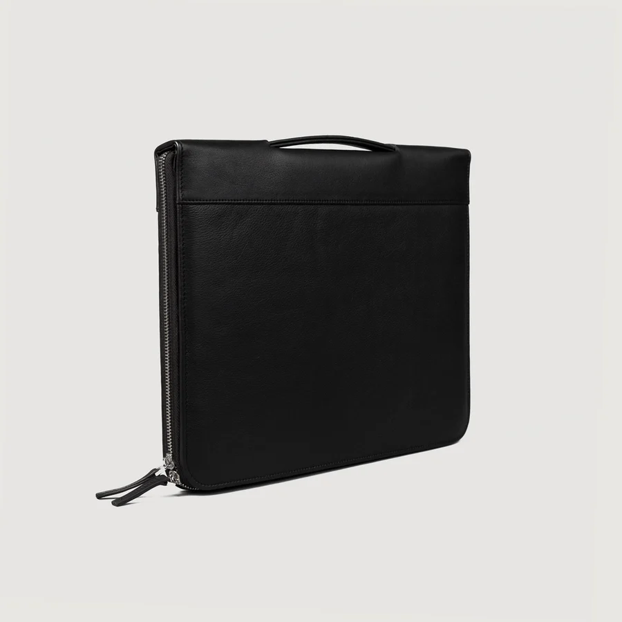 The black leather folio case features a top two-way zipper that runs along three sides, allowing easy access and secure storage.