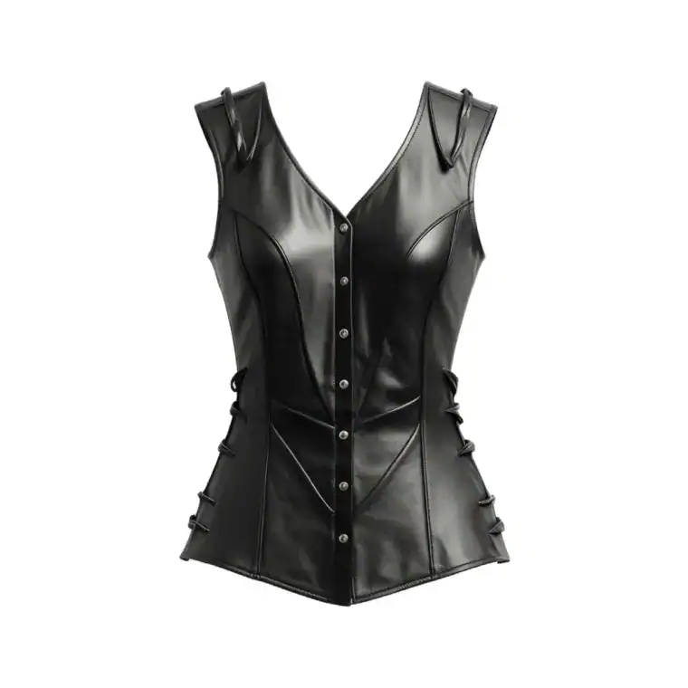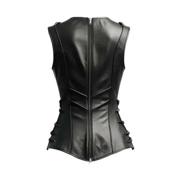 Designed as a button closure leather vest, it features lace-up side detailing and shoulder straps that add character while allowing subtle fit adjustments. The back zipper enhances security and structure without disrupting the clean front profile.