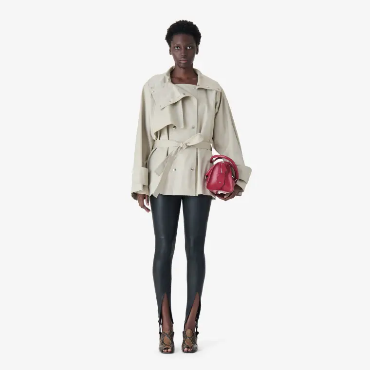 These leather stirrup leggings combine structure and stretch for a sleek, body-hugging fit. Crafted from a lambskin blend with added elastane, they offer flexibility while maintaining a smooth, tapered silhouette. The slim fit contours naturally, making them ideal for layering or statement styling.