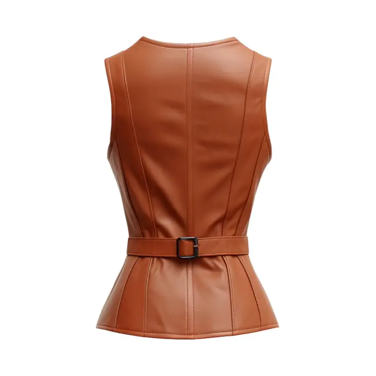 Designed as a women’s zipper leather vest, it features an adjustable belt that shapes the waist without restricting movement. The V-shaped neckline adds versatility, making it easy to layer over fitted tops or lightweight knits.