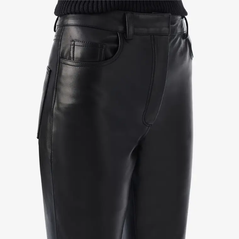 These black leather flare pants offer a modern take on a classic silhouette, blending structure with movement. Made from supple lambskin leather, they feature a relaxed fit through the hips before flowing into a gentle flare. The full-length design creates a clean, elongated line that flatters a wide range of body types.