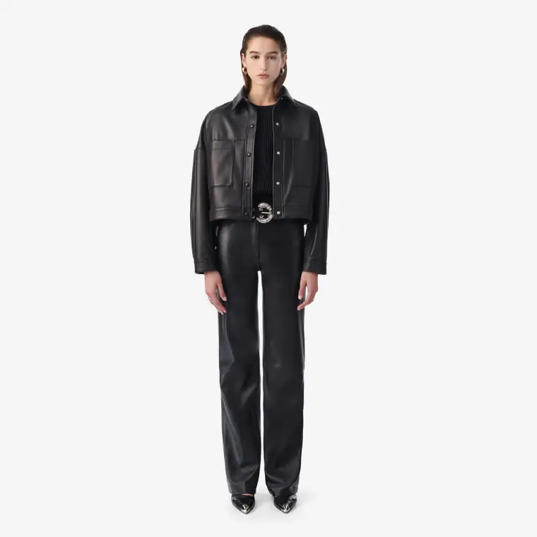 Designed as leather flare pants with everyday wearability in mind, they include a smooth zipper closure and practical side pockets. The balanced shape makes them easy to dress up with heels or keep casual with boots and knits.