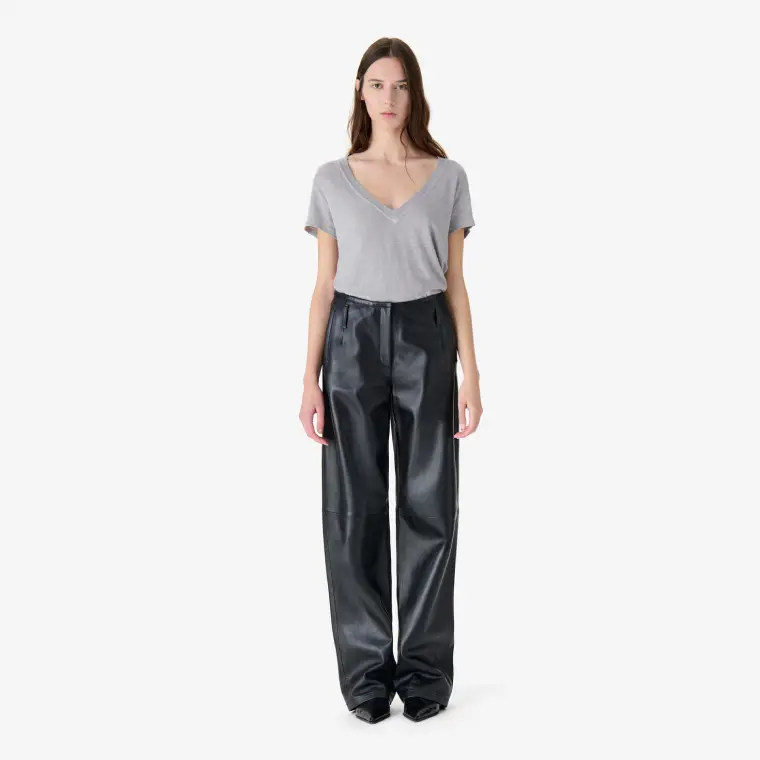 These wide leg leather pants deliver a bold yet relaxed silhouette designed for modern styling. Made from soft lambskin leather, they feature a wide, baggy fit that drapes naturally while allowing freedom of movement. The high-rise waist adds balance and structure to the overall shape.