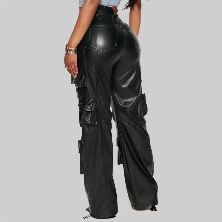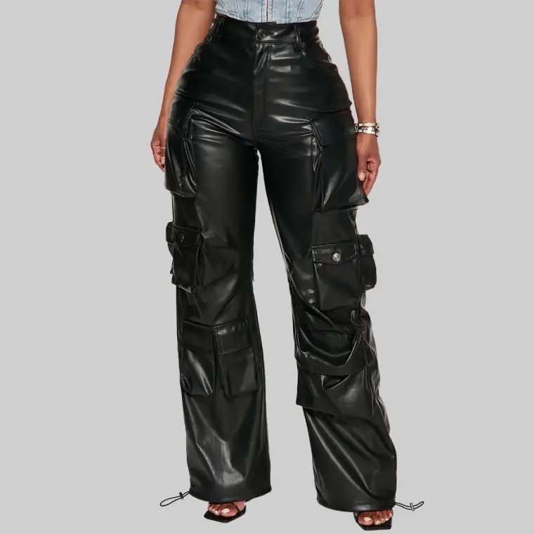 Women’s Wide Leg Multi-Pocket Leather Cargo Pants
