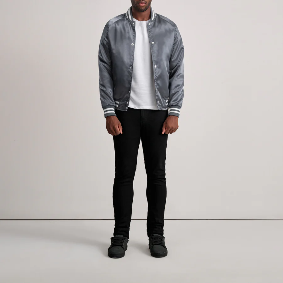 Built for effortless everyday wear, this grey varsity jacket delivers a clean athletic look with a refined finish. The smooth satin outer offers a polished, leather-inspired appearance without the weight, making it comfortable for extended use. Quilted polyester lining adds light insulation, while rib-knit cuffs and hem help maintain structure.