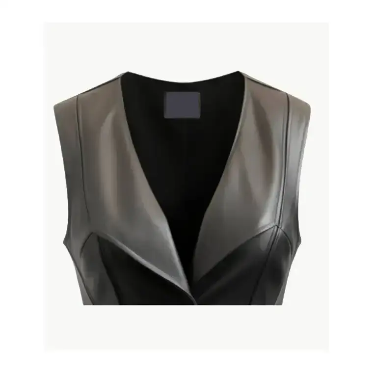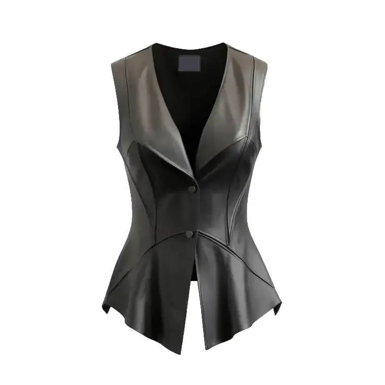 Designed as a black leather vest with buttons, it features visible seams, a flared bottom, and cut-back hemlines that add movement and structure. The V neckline keeps the look clean, making it easy to style across casual and high-end outfits.